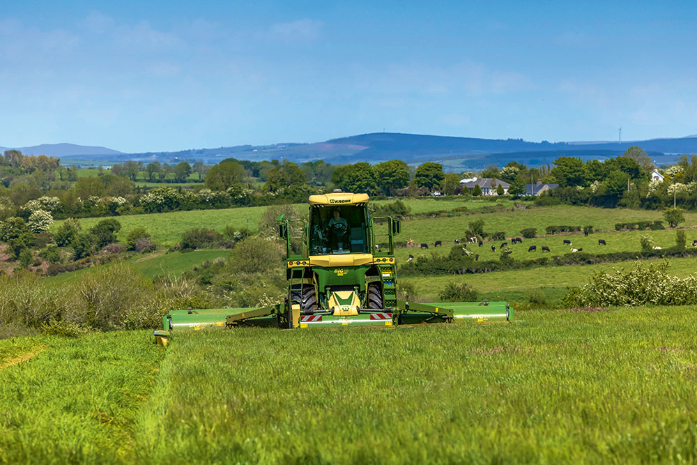 Spelle, duben 2023 – Novinka u BiG M: Samojízdný velkokapacitní žací mačkač od KRONE je nyní možné vybavit i příčným posuvem přední žací jednotky odvozeným podle náklonu stroje. Tento systém automaticky nastaví správný přestřih i při jízdě ve svahu, nebo při zatáčení. Výsledkem je čisté strniště bez vynechaných pruhů.