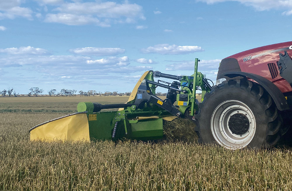 Zvýšený výkon čtyřmetrového čelně neseného žacího stroje se výrazně projevuje i při každodenním sečení zelené píce v kombinaci se sběracím vozem KRONE. Jako ideální řešení se zde osvědčil z kabiny traktoru pohodlně ovládaný žací nosník, hydraulicky sklopný prostřednictvím otočných převodovek. S přepravní šířkou pod tři metry lze se soupravu nejen bezpečně jezdit po silnici, ale také snadno manévrovat úzkými vjezdy do stájí i při vykládání na úzké krmné stoly.
