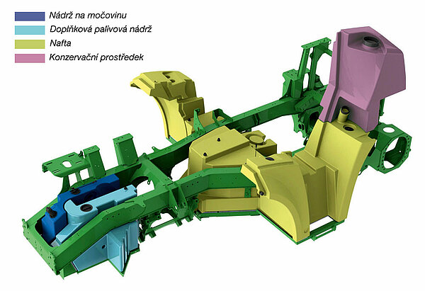 Ohromná palivová nádrž v základní výbavě pojme až 1 220 litrů nafty. Navíc je možné načerpat 115 litrů močoviny. Pak je možné pracovat celé dlouhé dny bez zastávky na tankování. Jako volitelná výbava je k dispozici přídavná 230litrová nádrž na palivo. Na pravé plošině vedle kabiny řidiče je umístěný hrubý dávkovač (0,5 až 7,5 l/min) konzervačního prostředku s nádrží o objemu 275 litrů. Na levé plošině je možné nainstalovat přesný dávkovač konzervantu (0,03 až 0,25 l/min) o objemu 20 litrů. Kromě toho je ke stroji možné připojit i externí zařízení na konzervační prostředek. Volitelně je možné přidávat konzervační prostředek i v závislosti na výnosu.