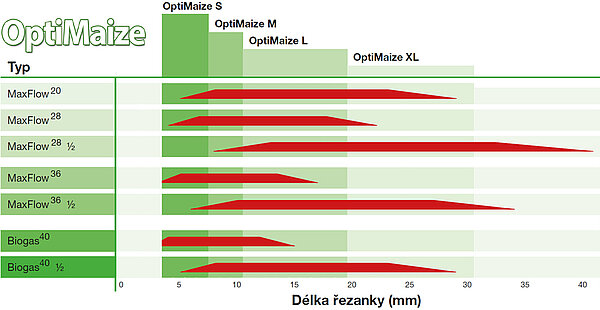 - Na trávu, zavadlou senáž, sklizeň celých rostlin na silážování a na kukuřici v OptiMaize S, M, L, XL
