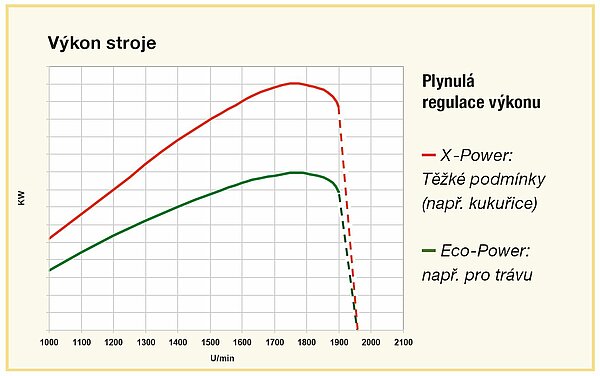 ConstantPower: ConstantPower reguluje rychlost jízdy řezačky v závislosti na vytížení motoru. Stiskem tlačítka si zvolíte požadované vytížení motoru. Stroj zcela automaticky upraví svoji rychlost jízdy podle porostu a sklízené hmoty. Tato funkce usnadňuje řidiči práci a poskytuje dosažení maximální kapacity při minimální spotřebě paliva. Ve spojení se zařízením AutoScan je možné další výrazné zvýšení výkonu při nejlepší kvalitě řezanky.