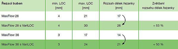 KRONE VariLOC významně rozšiřuje rozsah délky řezanky řezacích bubnů MaxFlow s 28 a 36 noži. U bubnu s 36 noži se spektrum rozšíří o 50 %, z délky 3 až 17 mm na nynějších 3 až 24 mm. U bubnu s 28 noži se rozsah délek řezanky zvětší dokonce o 45 %, a sice ze 4 až 22 mm na 4 až 30 mm. To je základním předpokladem pro možnost flexibilního přizpůsobení délky řezanky podle jejího dalšího využití.