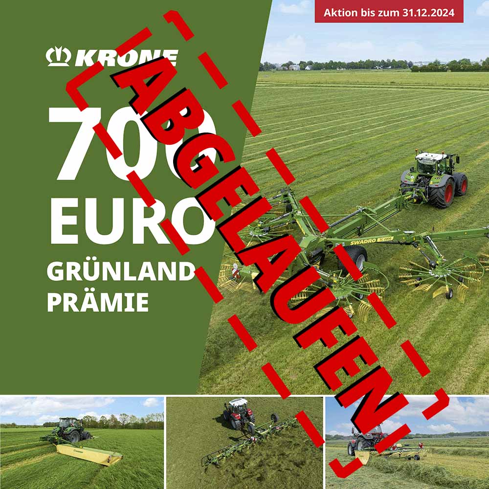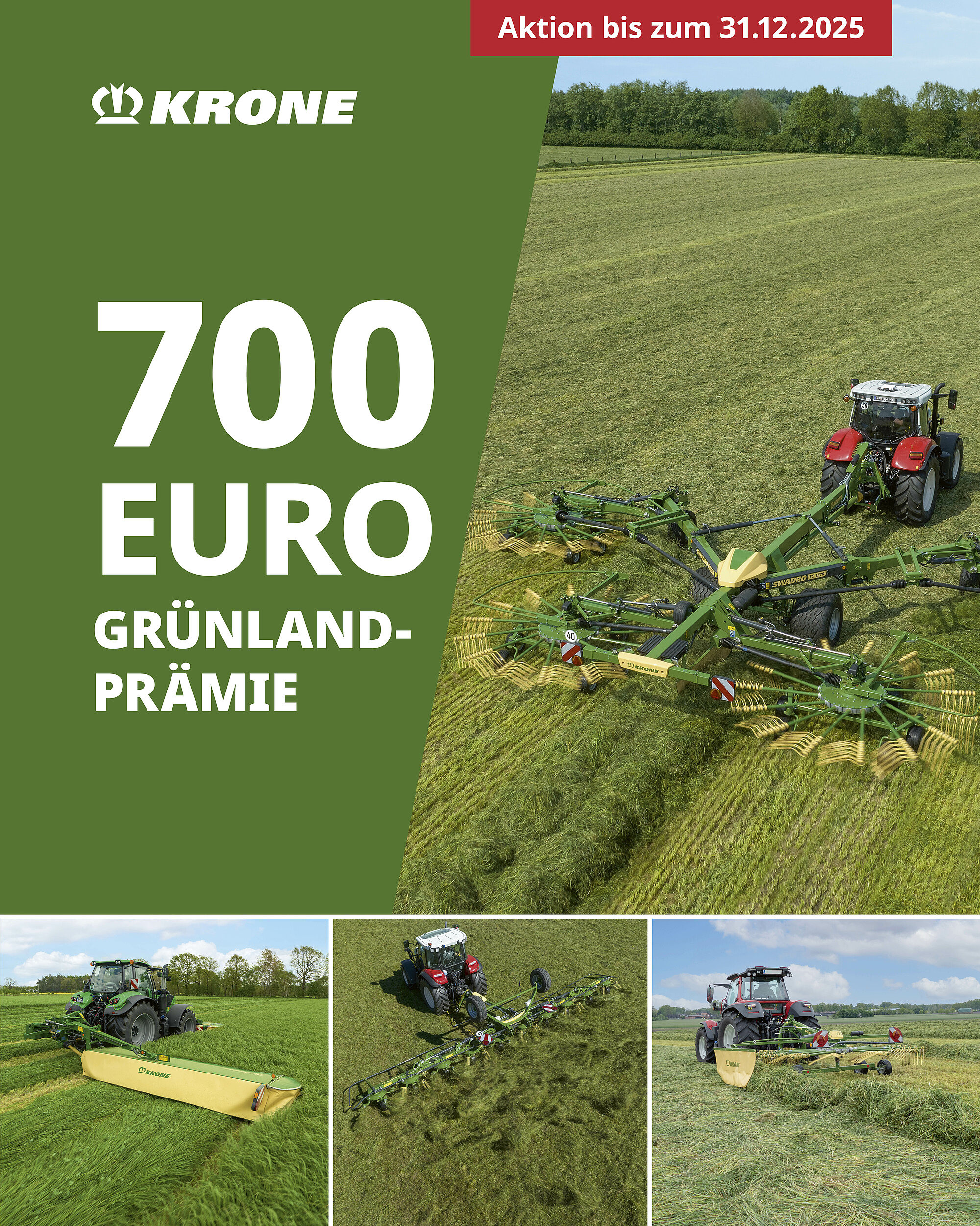 Sichere dir jetzt beim Kauf eines neuen KRONE Mähwerks, Wenders oder Schwaders eine Grünlandprämie von 700 Euro (inkl. MwSt.) pro Maschine.