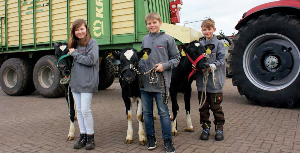 Die Zeitschrift agrarKids stellt in der aktuellen Ausgabe Familie Lühmann und ihren Betrieb vor. Die Jungzüchter Konrad und seine Freundinnen Charlotte und Katharina bereiten die Kälber für den Landeswettbewerb auf der BraLa vor. Bestes Qualitätsfutter für die Tiere ist dabei selbstverständlich. Um das Futter zu ernten, fährt zunächst die Dreifach-Mähkombination vorneweg mit Frontmähwerk (EC 32 CV Float) und Schmetterlingsmähwerk hinten (EC B 870 CV). Danach lädt der ZX 400 die Schwaden in seinen großen Ladebauch. Zuvor sorgt das große Schneidwerk mit deinen 46 Messern für gleichmäßige Schnittlängen, eine schonende Behandlung des Erntegutes und somit für eine hohe Futterqualität.