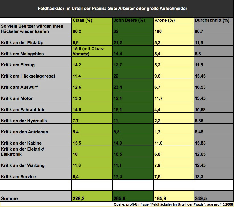 Im Rahmen dieser Umfrage wurden verschiedene Häcksler-Features der vier am Markt befindlichen Marken unter die Lupe genommen. Folgende Kategorien wurden abgefragt: Pick-up, Maisgebiss, Einzug, Häckselaggregat, Auswurf, Motor, Fahrantrieb, Hydraulik, Antriebe, Kabine, Elektrik/Elektronik, aber auch Wartung und Service. Eindeutiger Punktsieger dieser Vergleiche ist der Krone Big X, der in gleich zwölf der insgesamt 13 Kategorien den Maschinen von Claas, John Deere und New Holland deutlich den Rang abläuft. Lediglich in der Kategorie Service lag Krone an zweiter Position. Hier äußerten sich 7,6 Prozent der Praktiker kritisch; ein dennoch gutes Ergebnis, wenn man die Vergleichswerte heranzieht (6,4 Prozent beim Erstplatzierten sowie 17 bzw. knapp 22 Prozent beim Dritt- und Letztplatzierten).