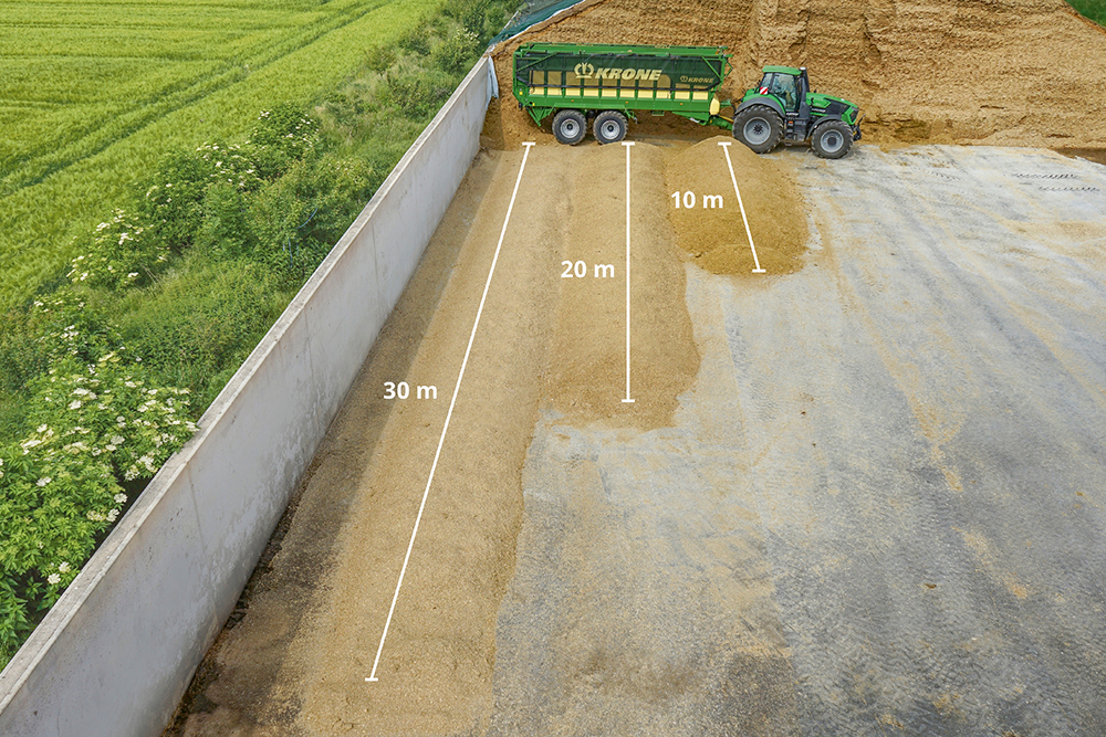 Der Vorteil des Feature KRONE ExactUnload liegt auf der Hand: An langen Erntetagen wird der Schlepperfahrer nachhaltig entlastet; er kann sich vollständig auf das Lenken und die Überwachung der Maschine konzentrieren. ExactUnload eignet sich insbesondere zum Anlegen von Silomieten oder für das präzise Entladen im Feld. Dank der gleichmäßigen Ablage wird das Erntegut bestmöglich verteilt und kann so im Nachgang optimal verdichtet werden.