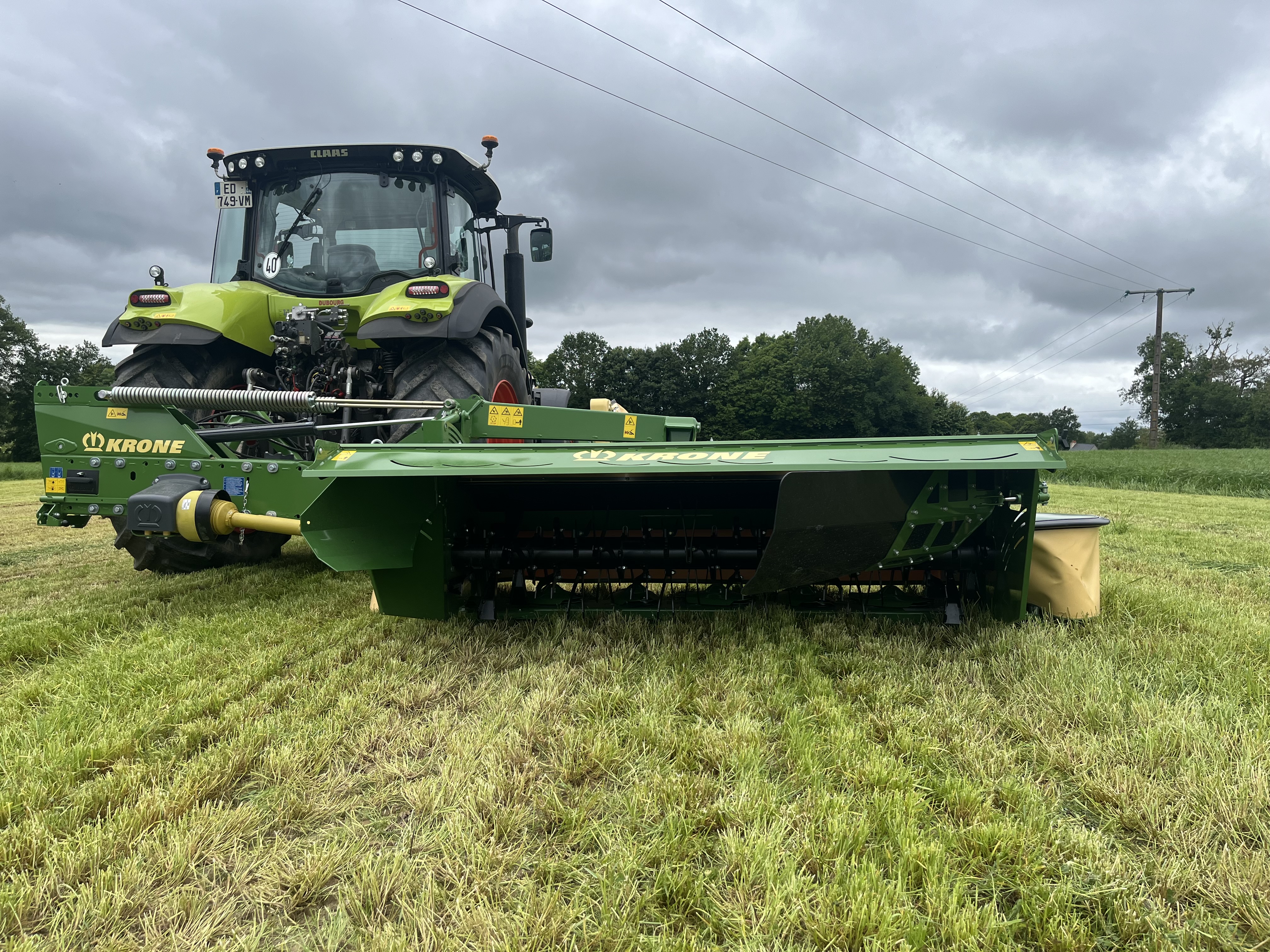 Les modèles EasyCut B 880 CV (Collect) sont la toute dernière génération de groupes de fauche avec conditionneur de la gamme KRONE. Présentés lors du salon AGRITECHNICA 2023, ils bénéficient des toutes dernières évolutions KRONE : lamier robuste EasyCut, nouvelle suspension oléopneumatique pour plus de confort et de respect de la couche herbacée, toiles tendues pour faciliter le lavage, conditionneur à fléaux CV ou à rouleaux polyuréthane CR ou acier MRolls, boîtier PreSelect DS 50 ou PreSelect Digital ou encore commande ISOBUS Confort. La dépose en andains n’est pas en reste grâce au système Collect : deux tapis à entraînement et abaissement hydraulique viennent récupérer le fourrage au niveau du conditionneur afin de la déposer au centre ou sur le côté selon les besoins de l’utilisateur, ou même directement à plat au sol si les tapis sont relevés. Jusqu’ici, il était possible de faire varier la largeur d’andains en faisant varier la vitesse des tapis depuis la cabine, ou encore via deux rouleaux accélérateurs d’andains à entraînement hydraulique. Avec une largeur de travail de 8m72 au plus large, ce modèle se situe dans le cœur de gamme du marché français des groupes de fauche avec conditionneur.