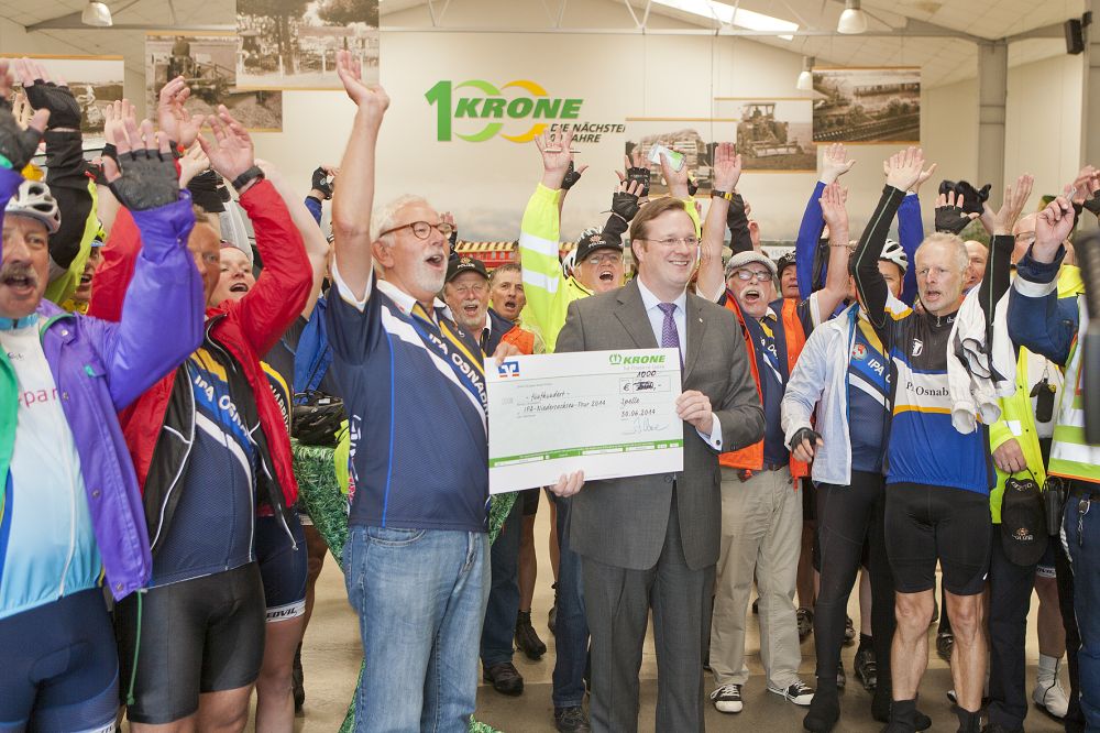 „Ihr Engagement für krebskranke Kinder ist vorbildlich und als Vater und Unternehmer freue ich mich sehr, dass Sie einen Zwischenstopp bei Krone einlegen“, betonte Bernard Krone. Im Namen der Teilnehmer bedankte sich Karl-Heinz Thiemann, Leiter der IPA Verbindungsstelle Osnabrück, für die Krone-Spende. Er berichtete, dass die IPA in den vergangenen 26 Jahren bereits 310.000 Euro für die Kinderkrebshilfe erradelt hat – und zwar ohne jeglichen Abzug von Verwaltungskosten. Nach einer kleinen Erfrischung ging es dann mit durchschnittlich 30 km/h weiter nach Osnabrück.