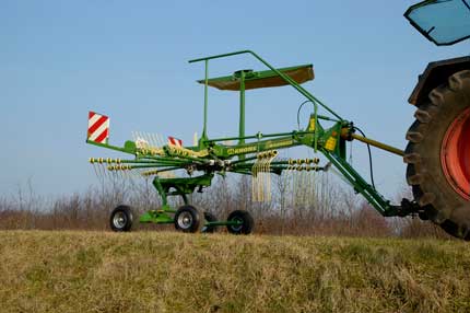 Spelle, im Juli 2006 – Gegen den Trend: Während für den Einsatz von schlagkräftigen Landmaschinen tendenziell auch besonders leistungsstarke Schlepper benötigt werden, bietet Krone mit dem Swadro 46T einen gezogenen Einkreiselschwader, der von Traktoren mit Motorleistungen ab 30 PS (21 kW) problemlos angetrieben werden kann. Der Schwader verfügt über eine höhenverstellbare Parallelzugdeichsel für die Anhängung im Zugpendel oder in der Ackerschiene. Für den Betrieb des Swadro 46 T ist nur ein einfachwirkendendes hydr. Steuergerät erforderlich. Mit 13 Zinkenarmen am Kreisel setzt Krone auf hohe Leistungen und bessere Rechqualität.