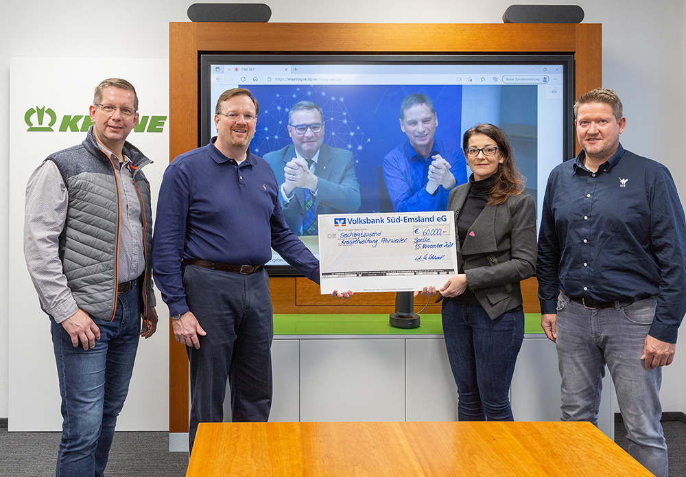 Spelle/Ahrweiler, 16. November 2021 – Insgesamt 260.000 Euro spendeten die Familie Krone, die KRONE Geschäftsführung und die KRONE Belegschaft an Opfer des verheerenden Hochwassers im Ahrtal. Einen Scheck in Höhe von 60.000 Euro überreichten jetzt auf virtuellem Weg Vertreter der KRONE Betriebsräte sowie Bernard Krone an Horst Gies und Karl-Heinz Porz vom Landkreis Ahrweiler.
