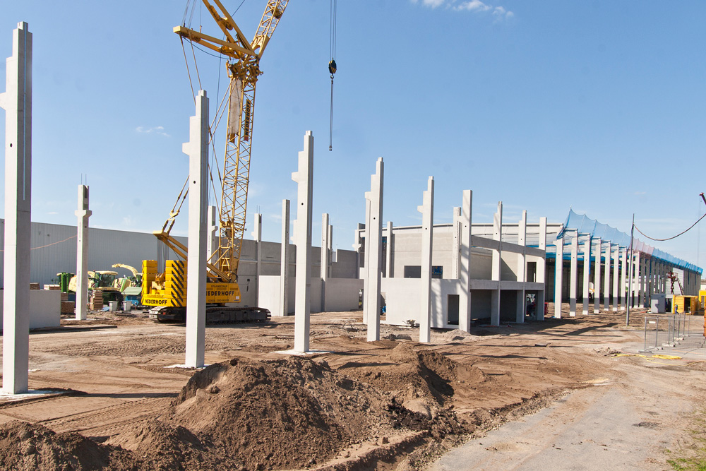 Spelle, im Juli 2013 – Auf Hochtouren laufen aktuell die Bauarbeiten am Krone-Standort Spelle. Ab dem 15. Oktober sollen in dem 265 m langen und 27 m breiten Neubau Feldhäcksler der Baureihe Big X gefertigt werden. Besondere Ausstattungsmerkmale des Neubaus sind modernste Montagestraßen mit einem Hochregallager für ein spezielles Logistikkonzept sowie End-of-Line-Prüfstände, in denen die fertigen Maschinen auf alle Funktionen überprüft werden.