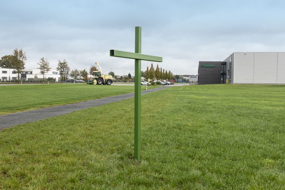 Spelle, 16. Oktober 2019 – Ein rund 2 m großes grünes Stahlkreuz hat Krone heute auf einer Fläche zwischen dem Krone Trainingszentrum und dem LVD Krone an der Portlandstraße in Spelle aufgestellt. Damit bekundet Krone, als einer der Repräsentanten der Landtechnik-Hersteller, seine Solidarität zur bundesweiten Aktion „Grüne Kreuze“. Das im typischen Krone-grün lackierte Kreuz soll Politik und Verbraucher zum Nachdenken über des im September verabschiedeten Agrarumweltpakets anregen.