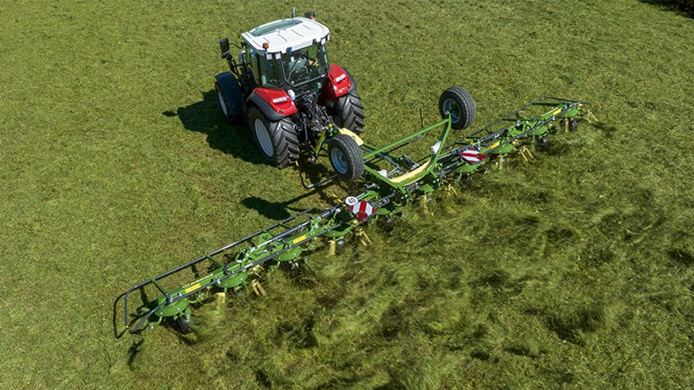 Die gewünschte Arbeitshöhe kann der Schlepperfahrer schnell über eine Handkurbel einstellen, auf Wunsch ist eine zentrale hydraulische Verstellung aus der Schlepperkabine verfügbar. Die Besonderheit beim Vendro C 1120: Durch das Chassis-System werden die Transporträder bei der Feldarbeit als vorderes Tastrad genutzt. Da die Transporträder sehr nah am Arbeitsradius der Zinken positioniert sind, werden die OptiTurn-Zinken exakt entlang der Bodenkontur geführt, was wiederum zu einer mustergültigen Rech- und Futterqualität führt.