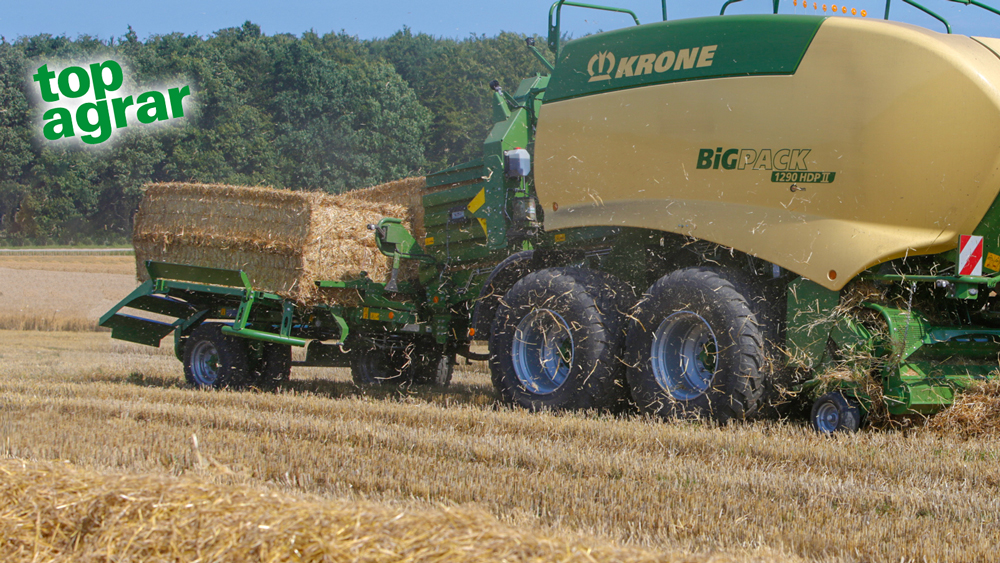 In Deutschland bekommt man für die normalerweise starren Ballensammelwagen hinter der Presse leider nur schwer eine Straßenerlaubnis. Mit dem neuen Konzept von KRONE läuft der Sammelwagen auf der Straße wie ein zweiter Anhänger hinterher. Auf dem Feld ist er starr mit der Presse verbunden. Für dieses Konzept liefert Krone eine allgemeine Betriebserlaubnis (ABE), was es für Deutschland äußerst interessant macht. Daher hat top agrar den KRONE BaleCollect im Einsatz getestet und mit der herkömmlichen Einzelablage von Großquaderballen verglichen.