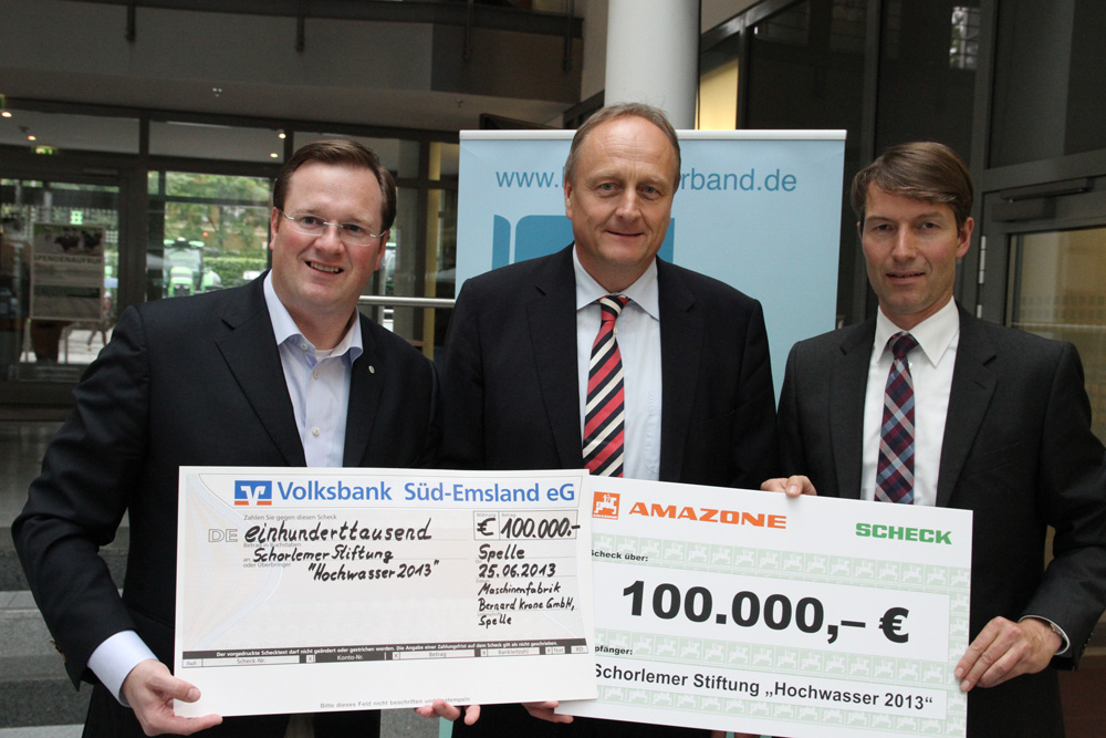 Hasbergen/Spelle, 17. Juni 2013 - In einer gemeinsamen Aktion spenden die Amazonen-Werke H. Dreyer GmbH & Co. KG und die Maschinenfabrik Bernard Krone GmbH jeweils einen Betrag in Höhe von 100.000 Euro zugunsten hochwassergeschädigter Landwirte. Die Spenden werden an ein vom Deutschen Bauernverband in Zusammenarbeit mit der Schorlemer-Stiftung eingerichtetes Spendenkonto überwiesen.