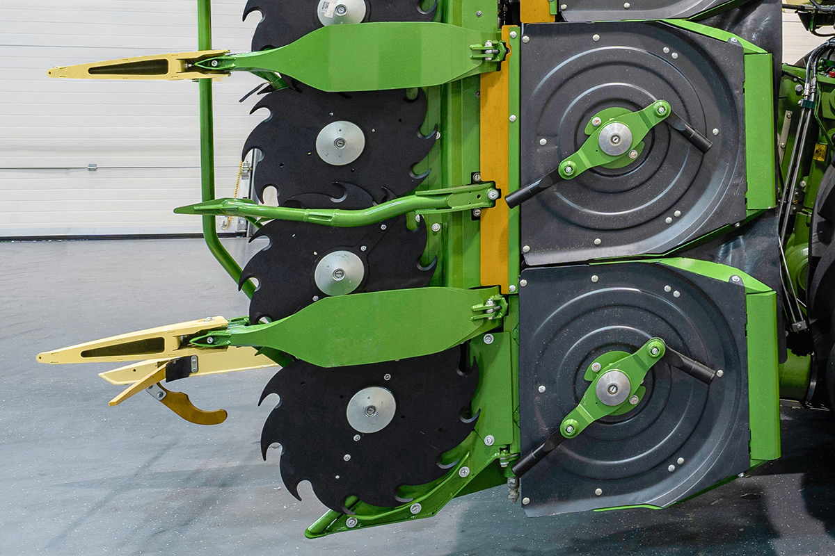 Hinter den Sichelscheiben rotieren Schlegel unter feststehenden Mulchergehäusen und zerkleinern die Maisstoppeln direkt nach dem Schnitt. Die Mulcheinheiten sind dabei einzeln aufgehangen und passen sich für ein perfektes Mulchergebnis individuell den Bodenkonturen an. So werden die Stoppeln effektiv bis unterhalb des ersten Halmknotens zerschlagen, bevor sie von den Reifen des Häckslers und den nachfolgenden Traktorgespannen in den Boden gedrückt werden. Das beschleunigt die Zersetzung der Erntereste deutlich.
