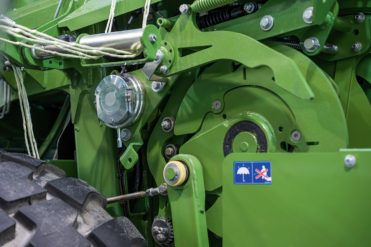 KRONE setzt bei der BiG Pack auf die elektronische Ballenlängenmessung mittels Sternrad. Dieses ist mittig im Presskanal angeordnet und durch eine seitliche Abdeckung vor Fremdkörpern und Verschmutzung geschützt.