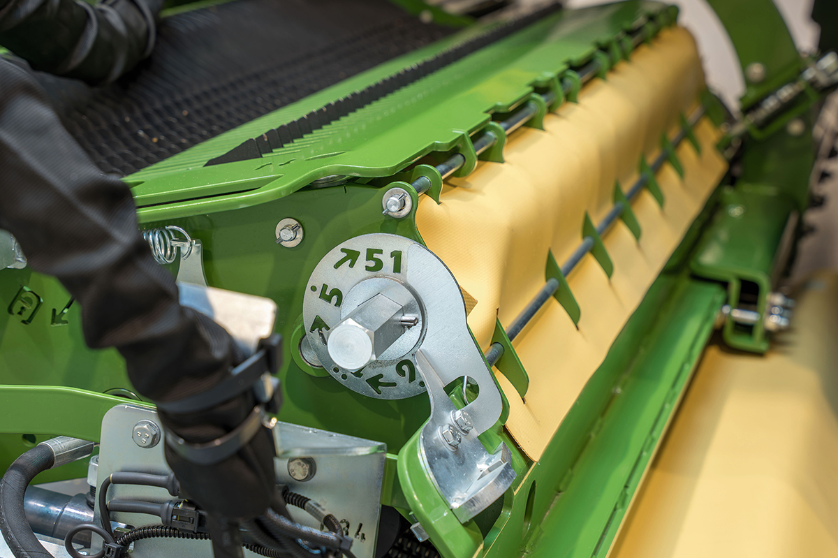 Der groß dimensionierte Rollenniederhalter sorgt für einen konstanten Gutfluss. Über ein doppeltwirkendes Steuergerät lässt sich der Niederhalter in der Höhe verstellen und so optimal an die Schwadgröße anpassen. Die eingestellte Höhe ist auf einer Skala ablesbar. Zudem wird der Niederhalter über Federn dauerhaft entlastet.