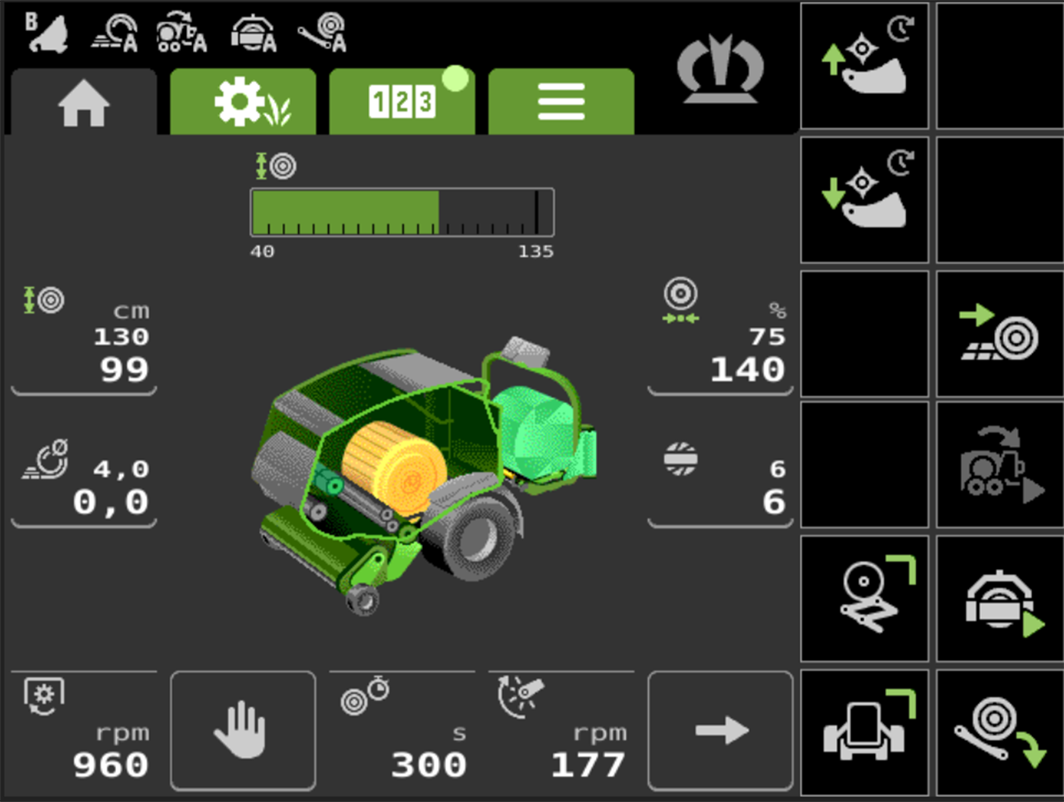 Die hydraulische Funktionen der angeschlossenen Anbaugeräte können mithilfe der elektrischen Vorwahlbedienung KRONE PreSelect Digital auf dem ISOBUS-Terminal vorgewählt und im Anschluss mit den traktorseitigen Steuerventilen betätigt werden. Die Symbole zeigen, welche Funktionen aktuell vorgewählt sind. Zudem ist beim KRONE PreSelect Digital je nach Produktgruppe ein Stunden- bzw. Fuhrenzähler integriert. Einstellungen, wie das Anpassen des Auflagedrucks der Mähwerke oder Kreiselhöhen beim Schwader können durch Betätigen der Symbole angepasst werden.
