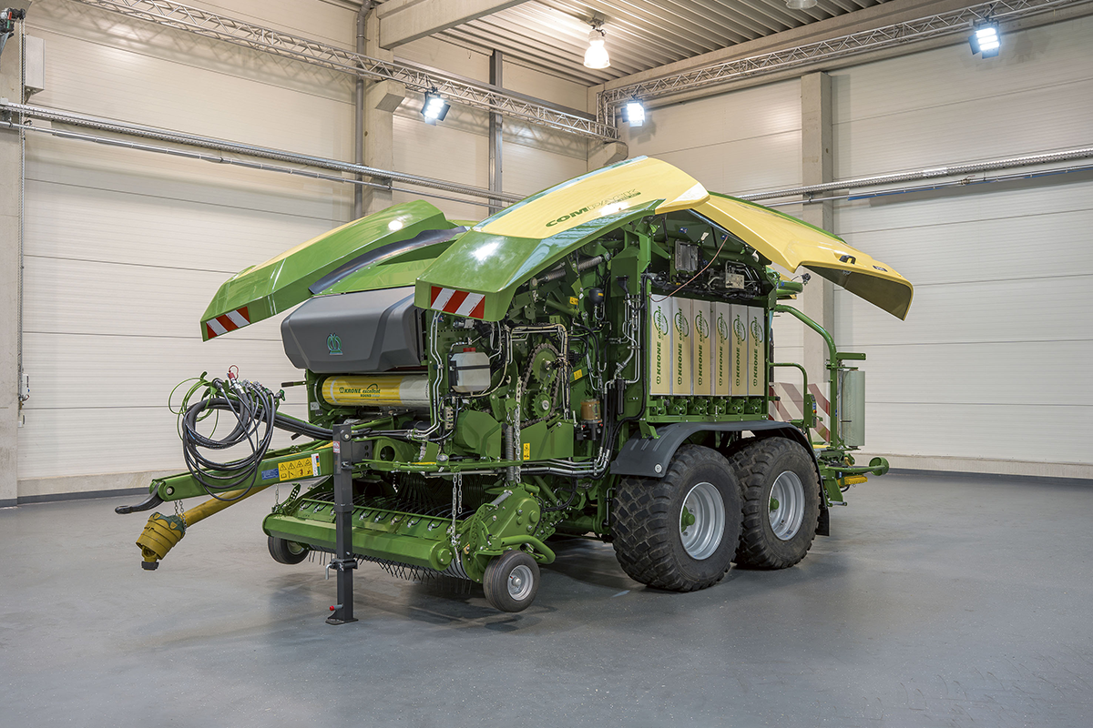 Die ComPack Pro überzeugt nicht nur durch hohe Pressleistung und Verdichtung, sondern auch durch ihren durchdachten Aufbau. Alle Wartungspunkte sind leicht zugänglich – Zentralschmierung und aktive Kettenspannung reduzieren den Aufwand auf ein Minimum. Optional lässt sich die Maschine mit einer integrierten Siliermitteldosieranlage ausstatten, die für eine exakte Dosierung sorgt und so die Qualität des Futters nachhaltig unterstützt.