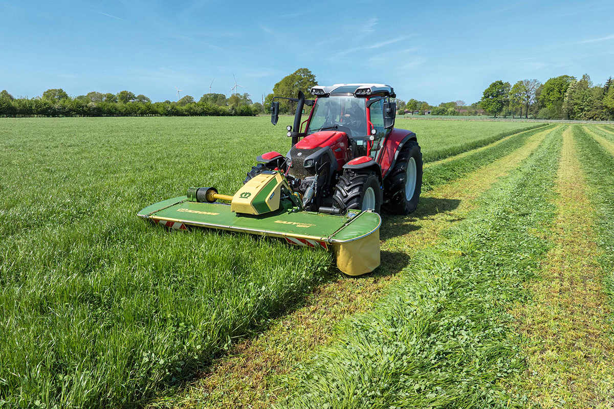 Die Frontmähwerke mit Arbeitsbreiten von 2,71 m bis 3,16 m sorgen mit ihren angetriebenen Schwadleittrommeln für beste Arbeitsergebnisse. Das Mähgut kann im Schwad abgelegt werden, und es wird nicht von den Schlepperreifen überfahren. Die Futterqualität steht im Fokus.