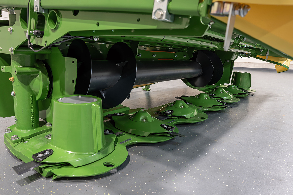 Der von KRONE entwickelte Satellitenantrieb im Mähholm: Groß dimensionierte Stirnräder mit bis zu 66 Zähnen übertragen die Hauptantriebskräfte bis zum Ende des Mähholmes. Aufgrund ihrer großen Durchmesser drehen sie langsamer und es greifen viele Zähne benachbarter Stirnräder ineinander. Diese Konstruktion besticht durch Laufruhe, beste Kraftübertragung und hohe Lebensdauer. Die vorgelagerten Nebenantriebe treiben jeweils nur eine einzelne Mähscheibe an und sind damit nur geringen Belastungen ausgesetzt.