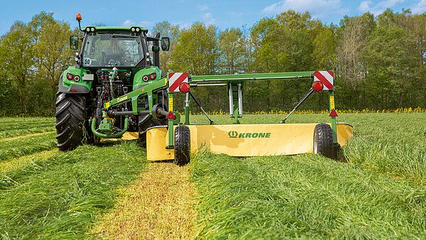 Die neuen gezogenen Mähwerke von KRONE mit Seitendeichsel überzeugen durch ihren einfachen und kompakten Aufbau. Die Mäheinheit wird rechts vom Schlepper geführt. Die kurze Bauform der seitlichen Deichsel begünstigt enge Wenderadien und spart Zeit am Vorgewende. Um die Schlagkraft zu erhöhen, kann auch in Kombination mit einem Frontmähwerk gearbeitet werden.