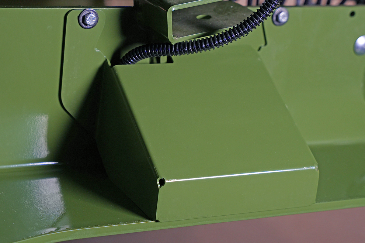 Das Öffnen und Schließen der Ganzstahlrückwand erfolgt über beidseitig angeordnete Hydraulikzylinder. Die automatische Ver- und Entriegelung erleichtert die Bedienung vom Schlepper aus.