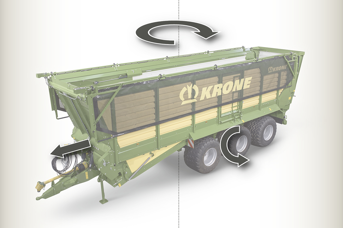 Mit Einführung des TX bietet KRONE erstmalig einen nach vorne hin abgesenkten Kratzboden beim Häckseltransportwagen. Die „Ladetasche“ erhöht das Transportvolumen und sorgt beim Beladen für eine bessere Traktion der Traktorhinterräder auf dem Feld. Der niedrige Schwerpunkt des Wagens verbessert das Fahrverhalten am Hang und bietet hohe Sicherheit bei schnellen Transportarbeiten.