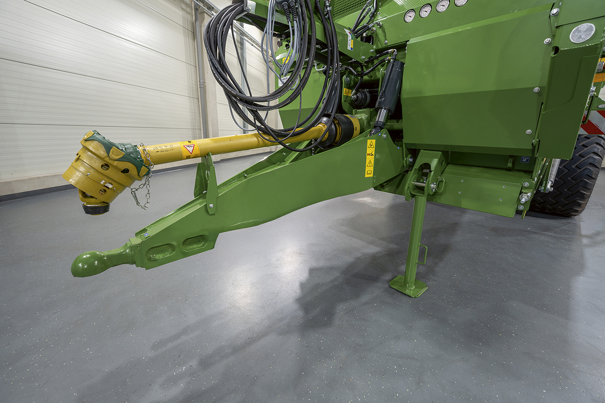 Der TX hat einen klappbaren Stützfuß. Zum An- und Abhängen lässt sich die Knickdeichsel hydraulisch an die Zugvorrichtung des Traktors anpassen. Das geht schnell und einfach.