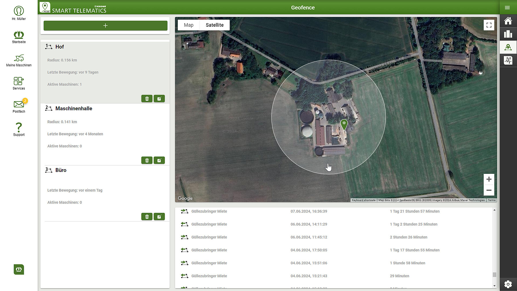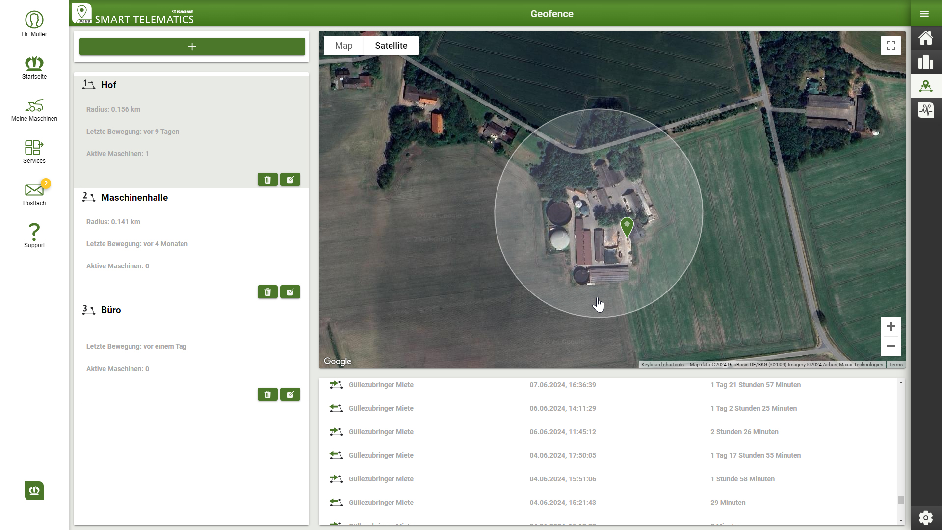 - NEU: Mit GeoFence wird ermittelt, wann eine Maschine einen bestimmten Bereich betritt bzw. verlässt.