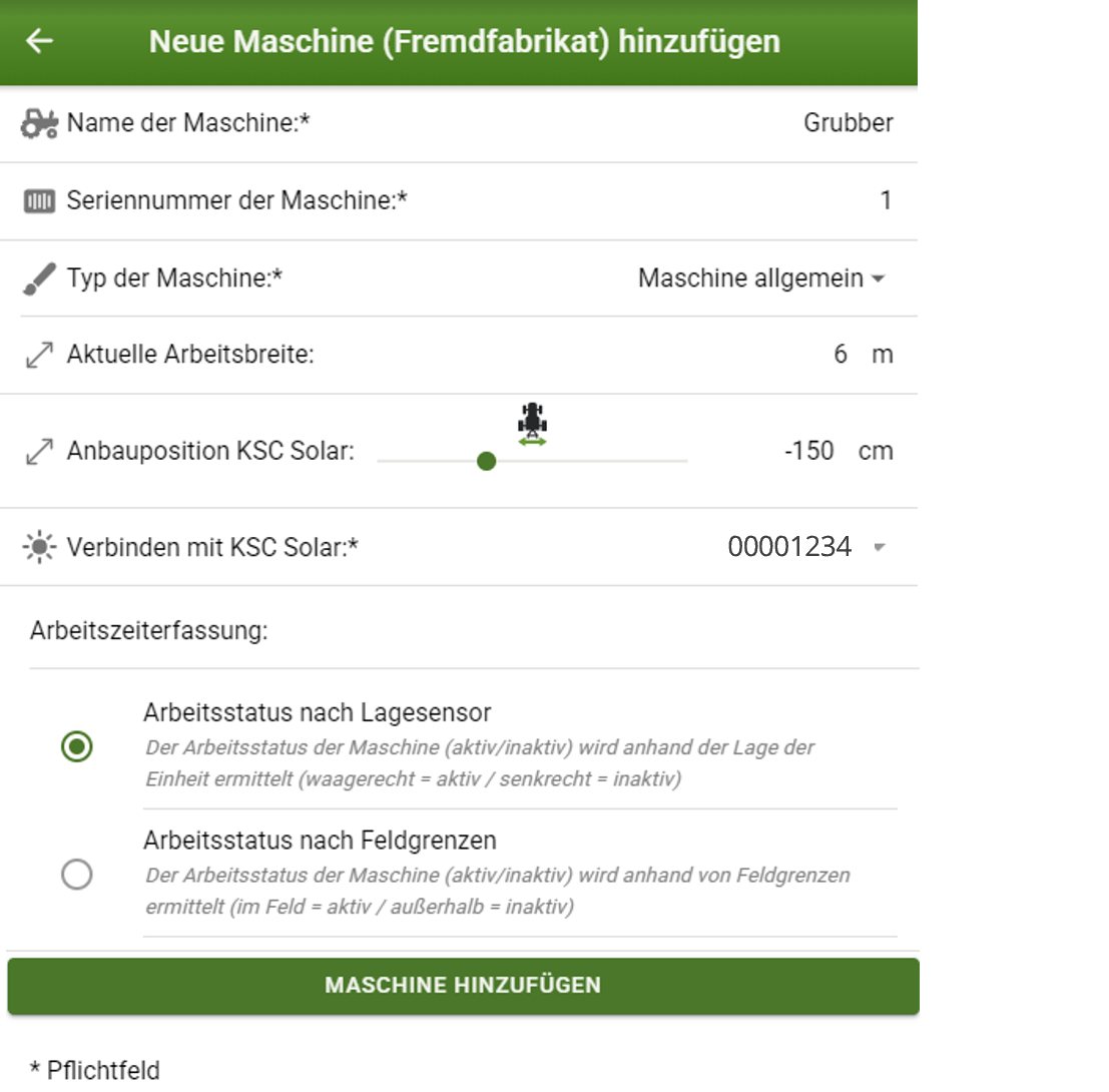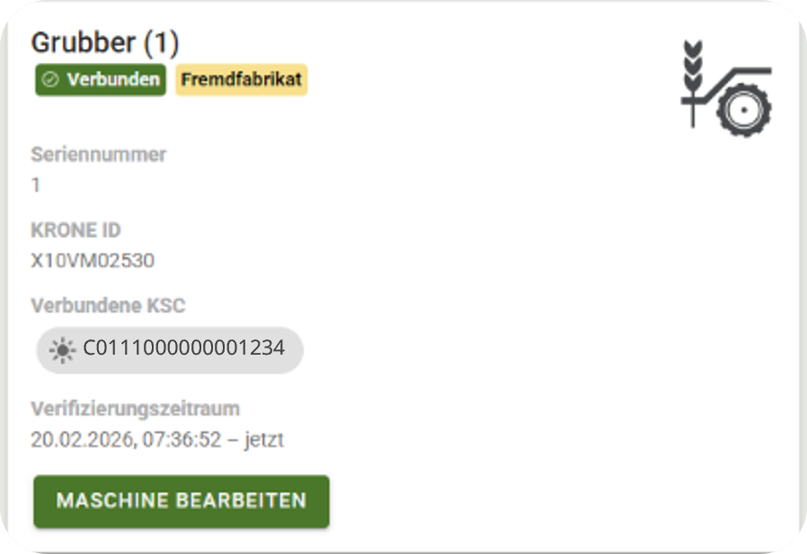 Unter „Meine Maschinen“ in mykrone.green kann nun die Maschine über die Seriennummer hinzugefügt werden. Die Arbeitsbreite wird automatisch hinterlegt.