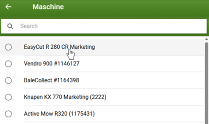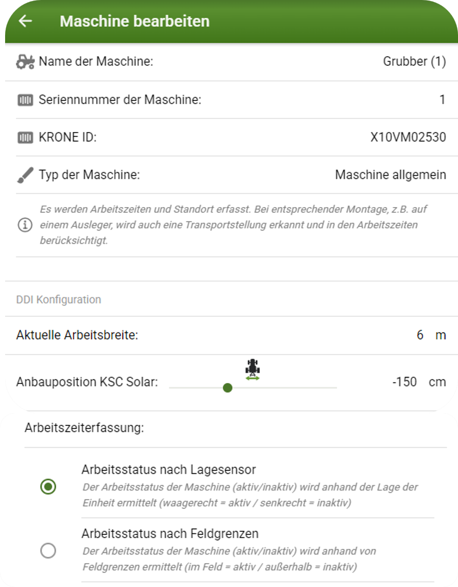 Bei Fremdmaschinen, die als Typ „Maschine allgemein“ angelegt sind, können Arbeitsbreiten hinterlegt werden. Bei KRONE Maschinen ist automatisch der entsprechende Typ und die Arbeitsbreite hinterlegt