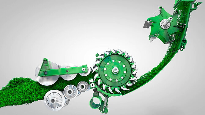 The VariStream Crop Flow System is introduced for the BiG X 650 in 2009. The sprung drum floor is connected to the anvil of the counter-blade at the front. When it is adjusted, the distance from the drum floor to the knife remains constant. This means that the chopping quality does not change even if the sprung drum floor deflects due to an uneven crop flow. With the spring-mounted rear wall of the throwing accelerator, you can achieve the highest throwing performance in all operating conditions and load the transport wagon with pinpoint accuracy. This clever solution not only impresses BiG X customers, but also the DLG - which is why KRONE has been awarded a silver medal for it.