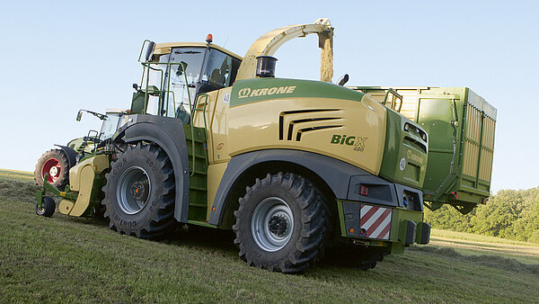 What has been possible with the BiG X 480 to 630 forage harvesters since 2013 is now also available for the BiG X 680 to 1180 models: With the new 680/80 R38 tyres on the front axle, these forage harvesters also achieve a transport width of just 3 m and can travel on public roads without a special permit. In combination with the optional transport chassis integrated on the XCollect maize header, the permissible axle load of 11.5 tonnes is also not exceeded. This means that the BiG X not only offers a high level of driving comfort on the road, but also ensures exemplary soil protection in the field thanks to its large contact area.