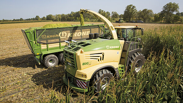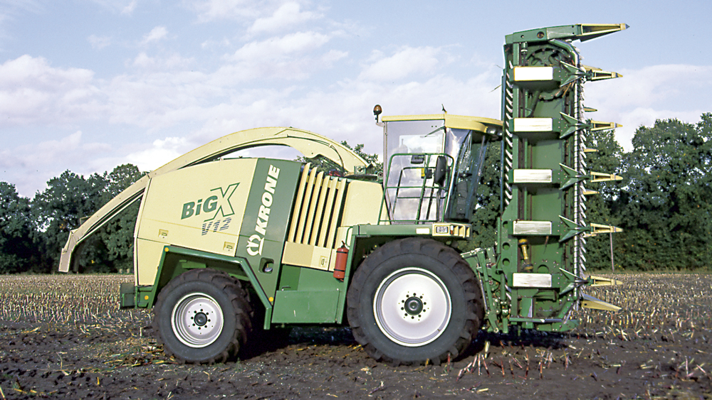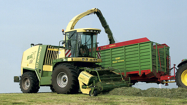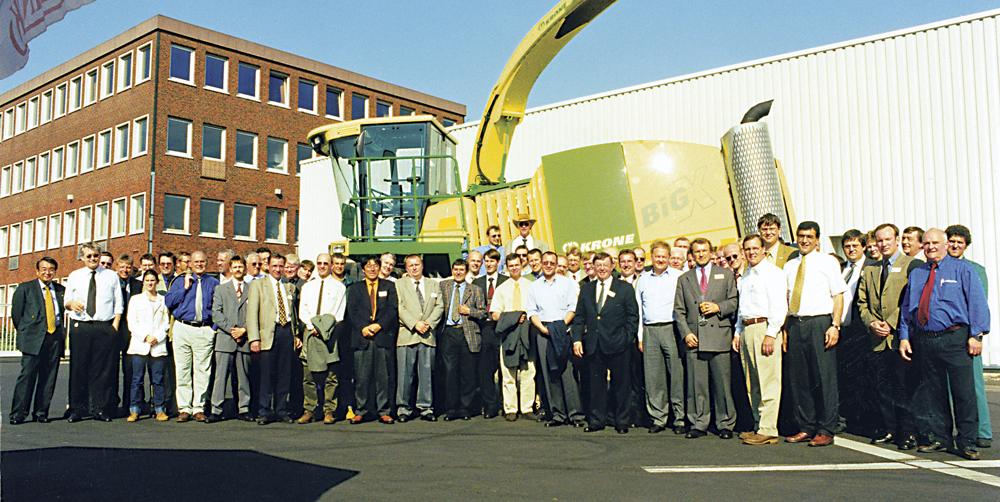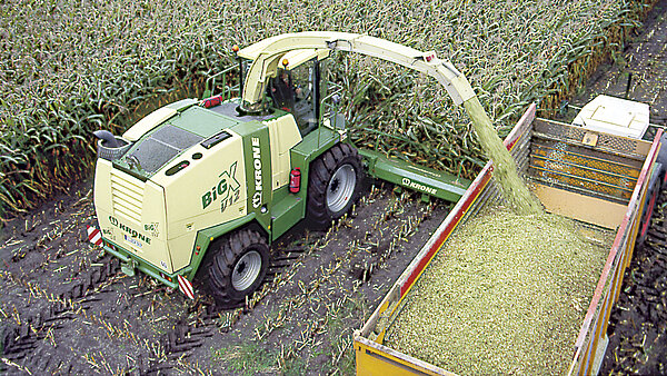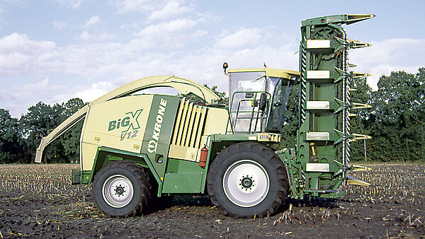 Following its rollout in 2000, the BiG X, after proving its commercial success, is available in two models in 2003: the BiG X V8 (605 hp) and the BiG X V12 (780 hp) as well as the EasyFlow grass header and 8, 10 and 12-row EasyCollect maize headers. The KRONE maize header with the endless collector principle differs significantly from all other existing row-independent maize headers and offers clear advantages for the farmer: excellent handling, low weight, reliability and low maintenance. Parallel to the rollout of the first BiG X series, KRONE also presented the new BiG X service team, at that time a six-strong customer service team. The specially trained service staff presented their personal BiG X customers with a BiG X service card with a BiG X hotline, which was available around the clock throughout the season.