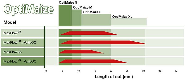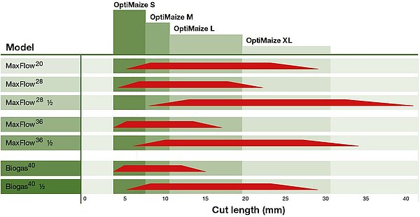 • For grass, wilted crops, whole crop silage and maize in OptiMaize S, M, L, XL