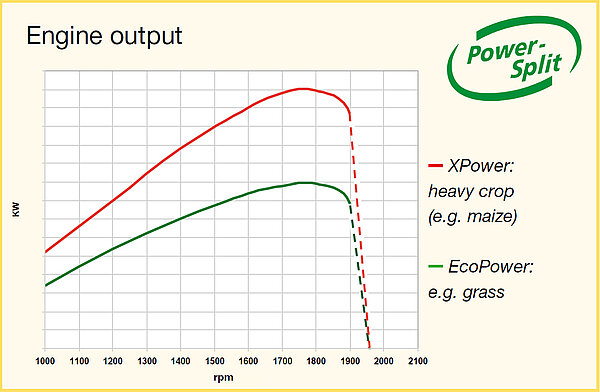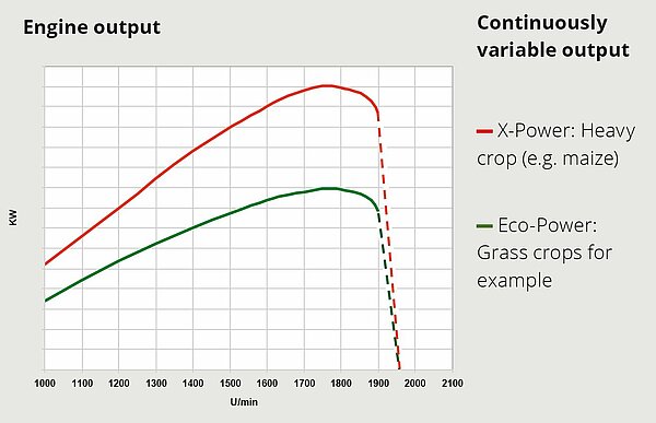 The innovative XtraPower technology allows owners of a BiG X 480 / 580 to book more engine power power (about 50 hp) from the new KRONE E-Solutions shops. Once this extra power is booked, it can be retrieved whenever it is necessary to boost throughputs temporarily. The machine must be in field mode and the chopping drum revolving to enable the feature. The XtraPower function is paused when no extra power is needed.