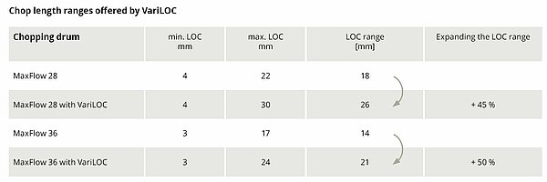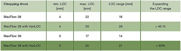 The 28-blade chopping drum is fit for universal application; with half a set of blades, it is perfectly suited for use with larger cutting lengths. Cutting length range: 28 blades: 4 – 22 mm, 14 blades: 8 – 42 mm