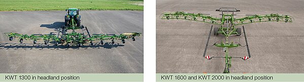 Both the KWT 1300 and the high-capacity KWT 1600 and KWT 2000 models fold automatically and sequence controlled from the cab thereby eliminating any risk of operator error. As a last step, a separate spool raises / lowers the booms into headland / work position.