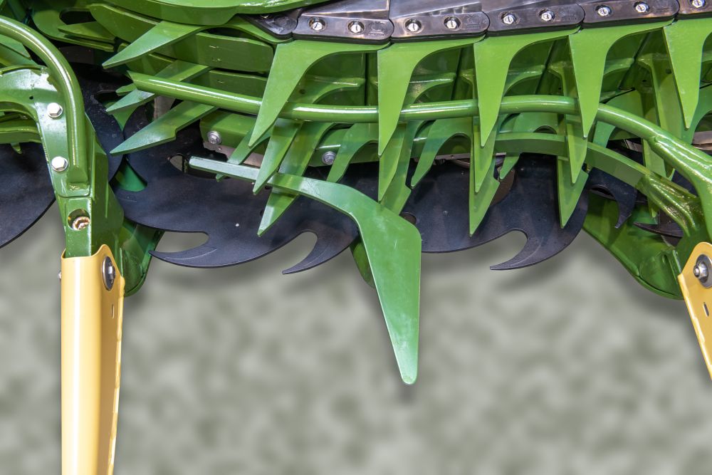Cada disco de corte está enlazado a su accionamiento por un perno central. El operador puede elegir entre dos velocidades, ajustando la frecuencia de corte a cada cultivo y parcela. El accionamiento está protegido por acoplamientos de trinquetes de estrella (la velocidad actual se muestra en la pantalla del terminal). Además, cada disco está protegido de forma individual por almohadillas anti-fricción.