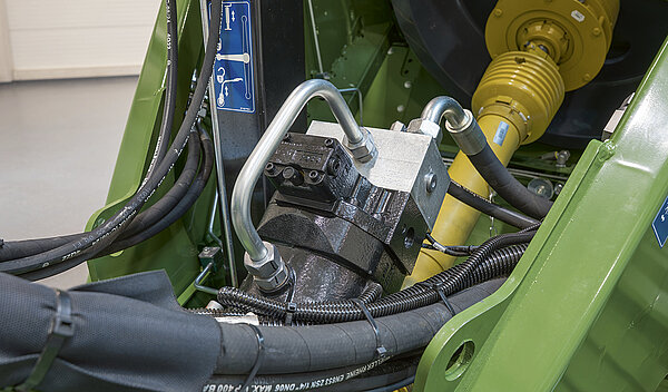 La instalación y desmontaje de la empacadora es especialmente fácil gracias al apoyo hidráulico – especialmente cuando se utiliza el acoplamiento de cabeza de bola K80. Durante la operación de prensado, se utiliza la misma unidad de control a través de una válvula de vías para ajustar cómodamente el rodillo de sujeción desde la cabina.