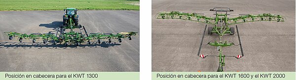 Con una anchura de transporte inferior a 3,00 m y una anchura de trabajo de 15,27 m o 19,60 m, los KWT 1600 y KWT 2000 son impresionantes no solo en el campo sino también en la carretera. El cambio de posición de trabajo a posición de transporte convence por su manejo y función. Las conexiones automáticas sucesivas liberan de trabajo al operador y aumentan así la producción diaria.