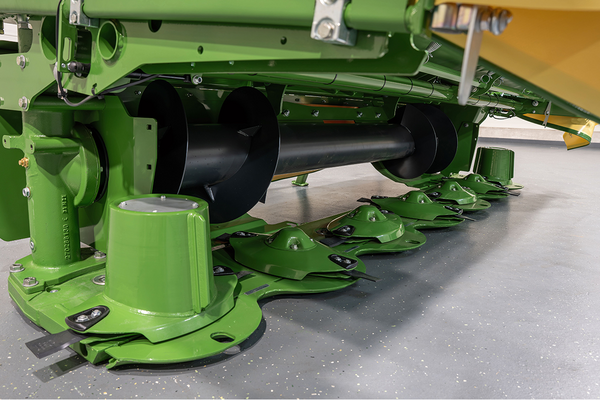 El accionamiento del acondicionador de rodillos tiene lugar mediante engranaje. El accionamiento del rodillo de compresión inferior está integrado en el accionamiento de la barra de corte. La suspensión por muelles del rodillo superior garantiza un flujo recolector continuo y el paso de cuerpos extraños incluso en terrenos irregulares. La distancia entre rodillos y la presión sobre el terreno se puede ajustar de forma continua para adaptarse a diferentes cantidades y tipos de forraje.
