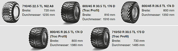 En el caso del grupo de eje trídem, usted también elige los neumáticos más aptos para sus aplicaciones. Los ligeros neumáticos anchos son cuidadosos con la capa de hierba y apenas dejan marcas de rodadura.