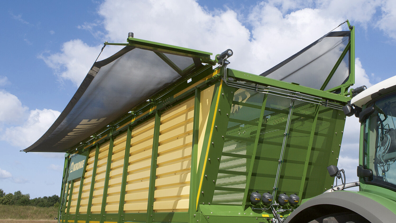 Los carros de transporte de picado de KRONE pueden equiparse opcionalmente con una cubierta del espacio de carga. No se pierde nada, ni siquiera cuando se circula rápido por carretera. La cubierta del espacio de carga se puede abrir y cerrar hidráulicamente.