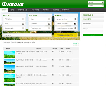 La médiathèque Krone propose des informations sur les notices d’utilisation, les listes de pièces de rechange, le service après-vente et les rapports d‘essais. Naturellement des photos et des vidéos actuelles de nos machines sont également accessibles sur la médiathèque. Différentes possibilités de visualisation des documents, telles que par exemple l’affichage miniature, permettent une présélection ciblée des informations qui peuvent être gérées dans un profil utilisateur individuel.