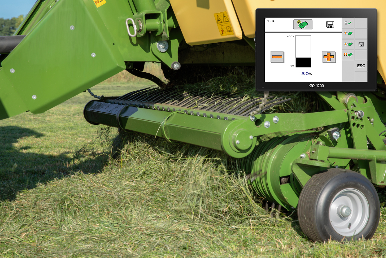 La régulation de suspension, équipée de série sur la machine, préserve non seulement la structure du sol, mais augmente aussi le confort du conducteur. La pression au sol du pick-up se règle en continu et confortablement depuis la cabine – une caractéristique que Krone est actuellement le seul à proposer. En conséquence, le conducteur peut ainsi modifier rapidement la position du pick-up en fonction des modifications des conditions de récolte. Ainsi, le pick-up progresse toujours en douceur au-dessus du sol et avec une pression au sol constante tout en ramassant proprement le fourrage – même sur les terrains irréguliers.