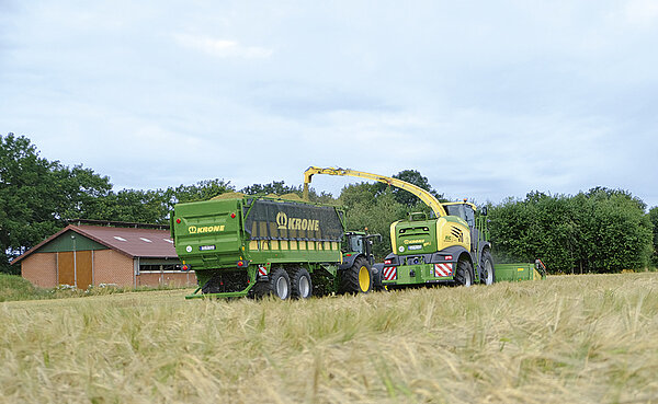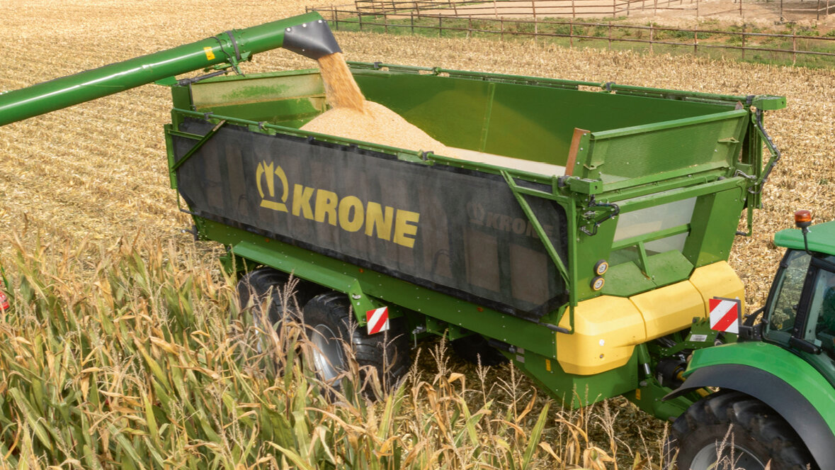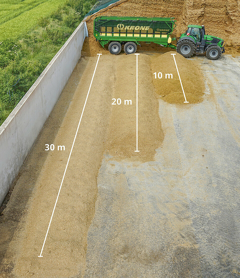 Il timone a ripiegamento idraulico e le paratie laterali regolabili rendono GX ottimamente attrezzato per il trasporto dell'insilato di mais, di erba o del tipo a pianta intera (GPS). Tipico KRONE: il carro da trasporto universale si scarica in un baleno, lasciando più tempo per il compattamento e questo salvaguarda la qualità del foraggio.