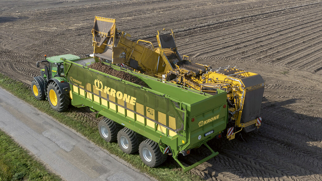 GX è l'ideale mezzo di trasporto per ogni tipo di ortaggio da campo. Patate, barbabietole ed anche verdure sono trattate con delicatezza durante carico e scarico. Il radiocomando opzionale permette di dosare lo scaricamento da GX dei prodotti che per la loro forma rotolano.